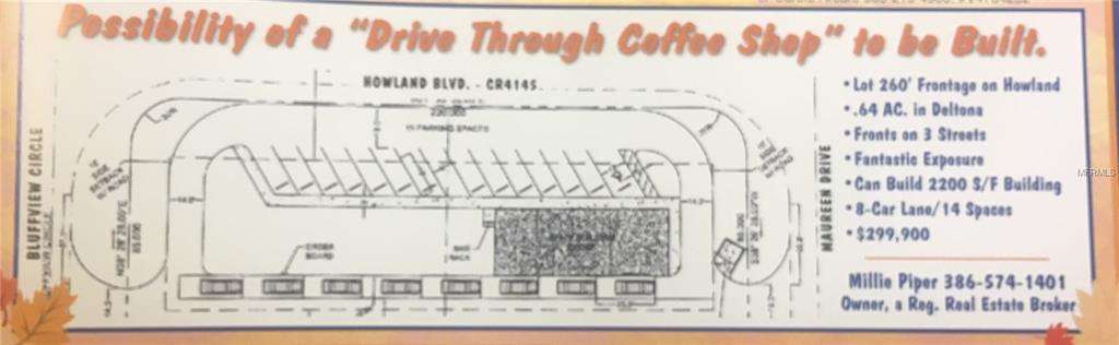 Make a left on to Bluffview drive across the back of the lots get you tacos then exit out onto Maureen Dr. this layout has been drawn up, with the setbacks, long narrow foot prints of the building and parking, 2,100 Sq. Ft building. 8 car holding lane and 12 parking spaces. Near Deltona’s Hospital on Howland and I4. Two corner lots. Ideal for retail/commercial locations. Across from Winn-Dixie. Near sewer and water. Great panoramic double corner exposure. Direct turning lane from Howland. Ideal for drive thru/fast food restaurant.